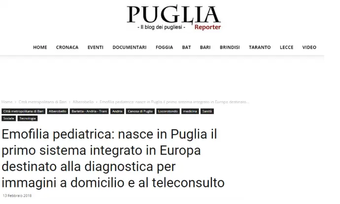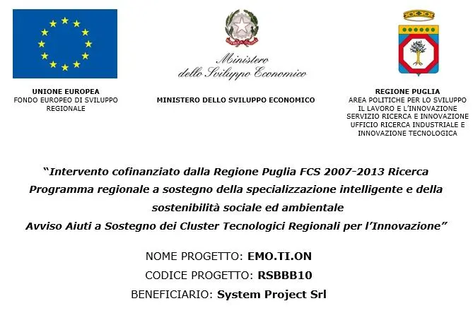 System Project Srl, in partnership con Questioncube Srl , CLE Srl, SEPI SpA, Tecnolab Group, Tecnosoft Srl, Università degli Studi di Bari – Dipartimento di Scienze Biomediche ed Oncologia Umana, ha sviluppando il Progetto EMO.TI.ON (Tecnologie per la sicurezza dei bambini con emofilia), approvato e cofinanziato dalla Regione Puglia Area Politiche per lo Sviluppo Economico, il Lavoro e l’Innovazione, a valere sul Programma “CLUSTER TECNOLOGICI REGIONALI“.